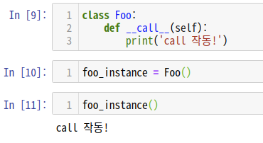 그리고 인스턴스를 만든 뒤, 소괄호를 실행하면 __call__ 메서드가 작동되는 것을 볼 수 있습니다.