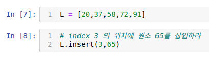 3번 인덱스 위치를 찾고 맨 뒤에 수를 한 칸 뒤의 인덱스로 밀어줘야 합니다. 그 뒤에 기존 3번 째 인덱스를 다시 4번째로 밀어줍니다. 마지막으로 65가 3번째 인덱스가 들어갑니다. 대략 4번 정도?의 연산이 일어나네요. 리스트 크기가 하나 증가하는 거지만 append를 할 때보다 좀 더 많은 일이 내부에서 일어납니다. 그래서 앞에 연산자들보다 시간복잡도가 큰 거 같습니다.