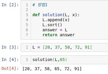 리스트 L 과 정수 x 가 인자로 주어질 때, 리스트 내의 올바른 위치에 x 를 삽입하여 그 결과 리스트를 반환하는 함수 solution 을 완성하세요.
