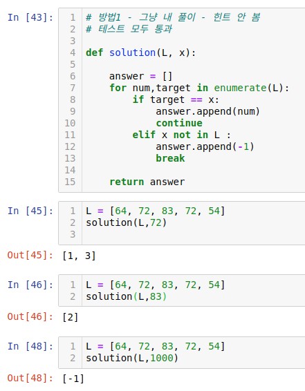 인자로 주어지는 리스트 L 내에서, 또한 인자로 주어지는 원소 x 가 발견되는 모든 인덱스를 구하여 이 인덱스들로 이루어진 리스트를 반환하는 함수 solution 을 완성하세요.