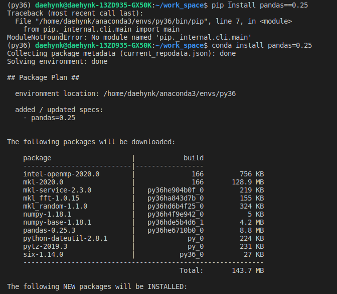 - 저의 경우에는 해당 가상환경에서 pip 가 먹질 않습니다. 아니 vscode 자체에서 로컬에서도 pip 가 안 먹습니다 ㅠㅠ