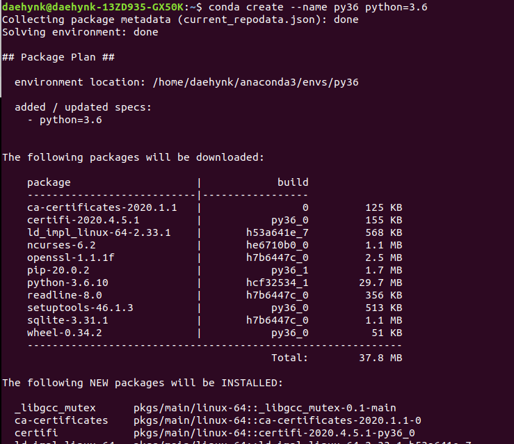 - 'py36' 부분은 가상환경 이름이니깐 원하는 이름으로 해주시면 됩니다.