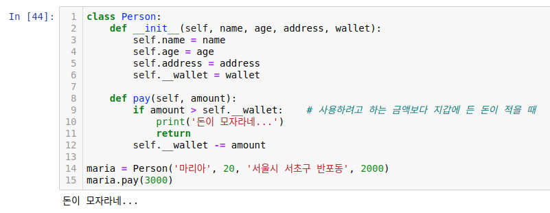 self.__wallet 을 보면 비공개 속성으로 만듬을 확인할 수 있었고 pay 메서드 안에서 접근하는 것을 확인할 수 있습니다.