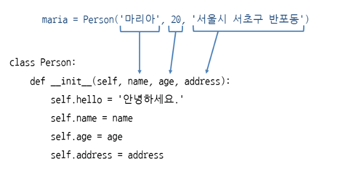 위 그림처럼 Person 괄호 안에 넣은 값이 __init__ 메서드에서 self 뒤에 있는 매개 변수가 차례대로 들어갑니다.