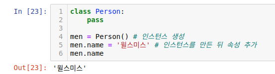 지금까지 클래스의 인스턴스 속성은 __init__ 메서드에서 추가한 뒤 사용했습니다. 하지만 클래스로 인스턴스를 만든 뒤에도 인스턴스.속성 = 값 형식으로 속성을 계속 추가할 수 있습니다. 다음 Person 클래스는 빈 클래스이지만 인스턴스를 만든 뒤 name 속성을 추가합니다.