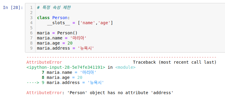 인스턴스는 자유롭게 속성을 추가할 수 있지만 특정 속성만 허용하고 다른 속성은 제한하고 싶을 수도 있습니다. 이때는 클래스에서 __slots__에 허용할 속성 이름을 리스트로 넣어주면 됩니다. 특히 속성 이름은 반드시 문자열로 지정해줍니다.