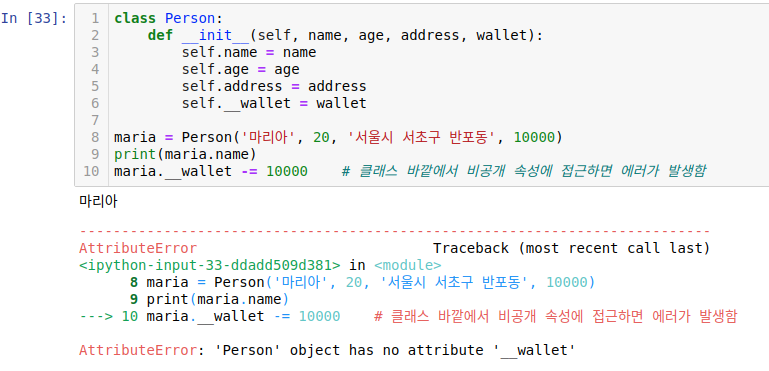 실행을 해보면 에러가 발생합니다. self.__wallet처럼 앞에 밑줄 두 개를 붙여서 비공개 속성으로 만들었으므로 클래스 바깥에서 maria.__wallet으로는 접근할 수 없습니다.