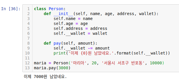 maria 인스턴스에서도 pay 메서드를 통해 __wallet 속성에 접근하는 것을 코드에서 확인할 수 있습니다.