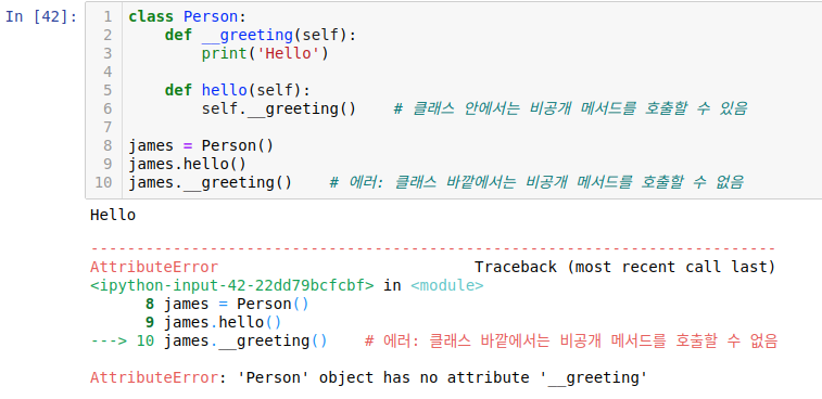 속성뿐만 아니라 메서드도 이름이 __(밑줄 두 개)로 시작하면 클래스 안에서만 호출할 수 있는 비공개 메서드가 됩니다.