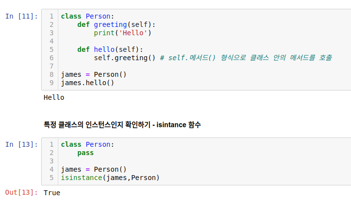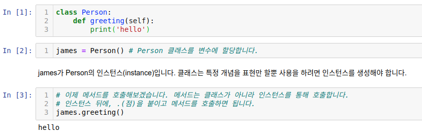 메서드(hello) 안에서 메서드(greeting)를 호출할 때 다음처럼 self.메서드() 형식으로 호출해야 합니다. self 없이 메서드 이름만 사용하면 클래스 바깥쪽에 있는 함수를 호출한다는 뜻이 됩니다.