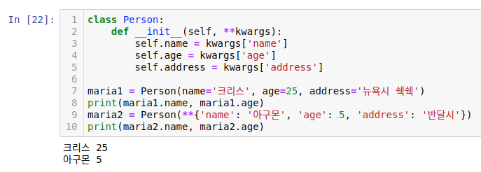 키워드 인수와 딕셔너리 언패킹을 사용하려면 다음과 같이 **kwargs를 사용하면 됩니다. 이때 매개변수에서 값을 가져오려면 kwargs['name']처럼 사용해야 합니다.