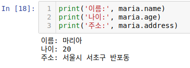 다음과 같이 maria.name, maria.age, maria.address의 값을 출력해보면 Person으로 인스턴스를 만들 때 넣었던 값이 출력됩니다. 이렇게 인스턴스를 통해 접근하는 속성을 인스턴스 속성이라 부릅니다.