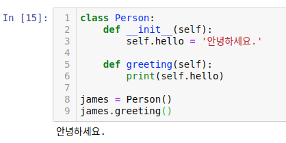 self는 인스턴스 자기 자신을 의미합니다. 우리는 인스턴스가 생성될 때 self.hello = '안녕하세요.'처럼 자기 자신에 속성을 추가했습니다. 여기서 __init__의 매개변수 self에 들어가는 값은 Person()이라 할 수 있습니다. 그리고 self가 완성된 뒤 james에 할당됩니다. 이후 메서드를 호출하면 현재 인스턴스가 자동으로 매개변수 self에 들어옵니다. 그래서 greeting 메서드에서 print(self.hello)처럼 속성을 출력할 수 있었던 것입니다.